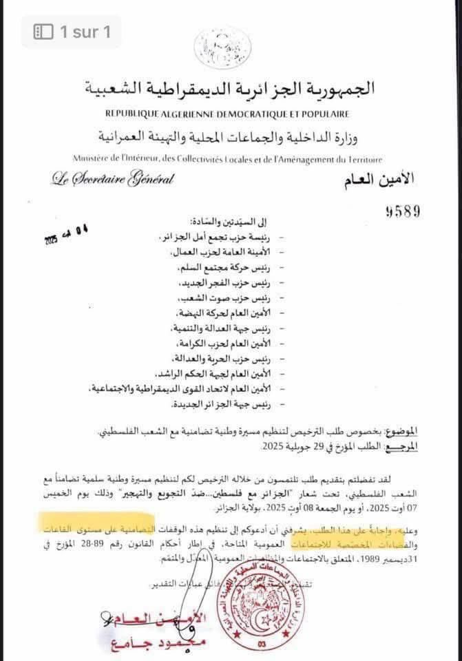 An official Algerian document reveals a glaring contradiction between the official rhetoric of Algeria’s military establishment and its practices on the ground, particularly concerning the Palestinian issue that dominates its media and political discourse. While various Moroccan cities—from Rabat to Casablanca, Fez, Agadir, Tangier, Marrakech, Oujda, and even remote villages—have witnessed dozens of spontaneous and organized solidarity rallies, with public squares filling with Palestinian flags and chants condemning the aggression, a different reality is exposed by an internal document issued by the Algerian Ministry of the Interior. Dated August 1, 2025, and numbered 9589, the document explicitly rejects a request to authorize a solidarity march with the Palestinian people, called for by a group of Algerian political parties for August 7. The justification provided is that the law does not permit demonstrations in open spaces such as squares and streets, and that any such activity must be confined to enclosed halls.